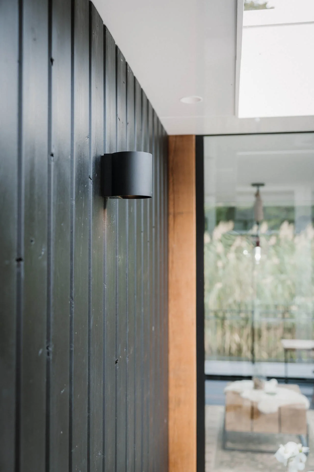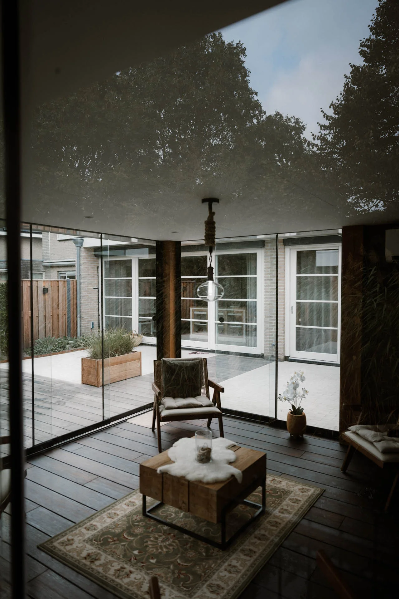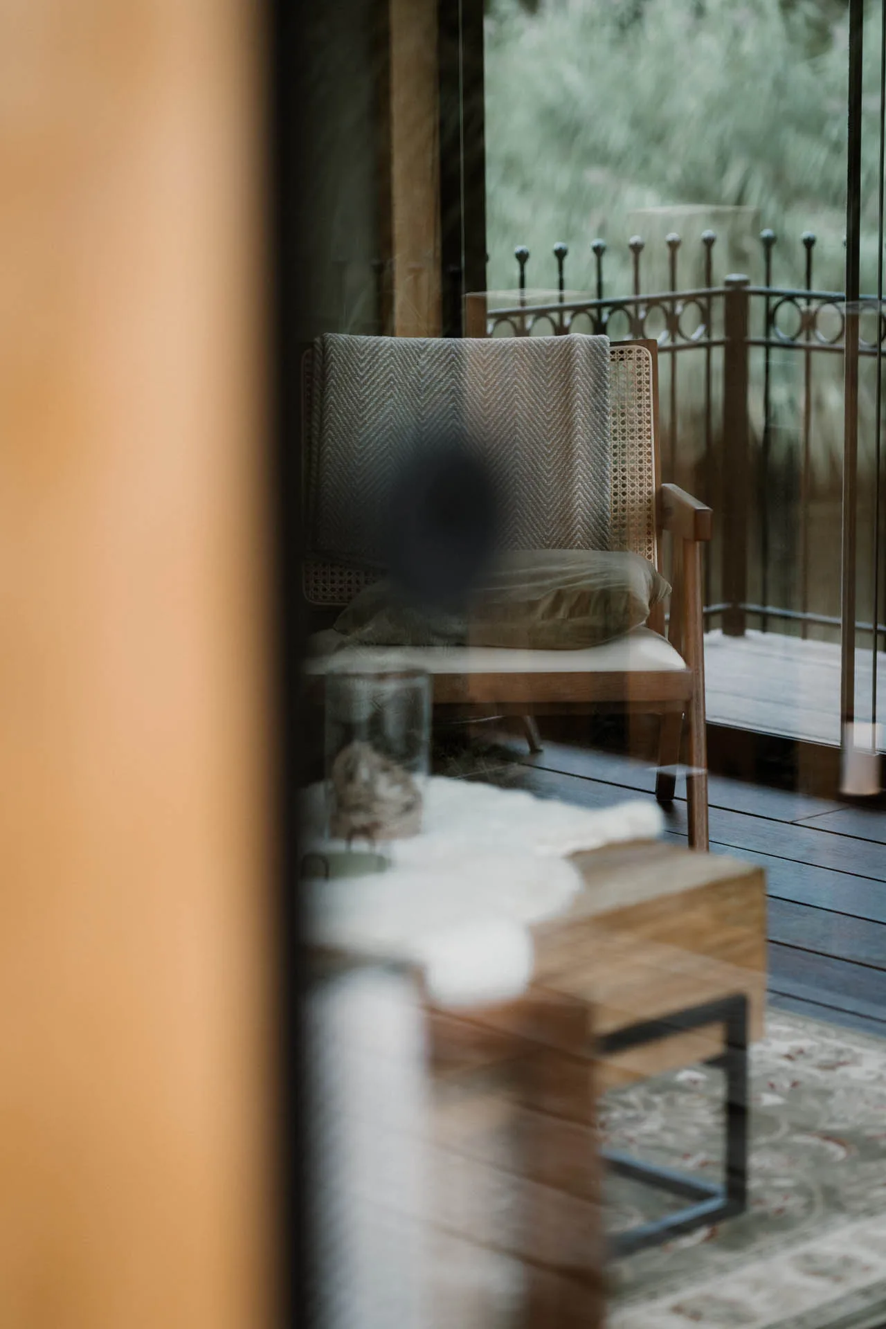 Twee keramische mokken op een houten bijzettafel in een sfeervolle lounge- of zithoek van een modern buitenverblijf met kussens en groen in de achtergrond.