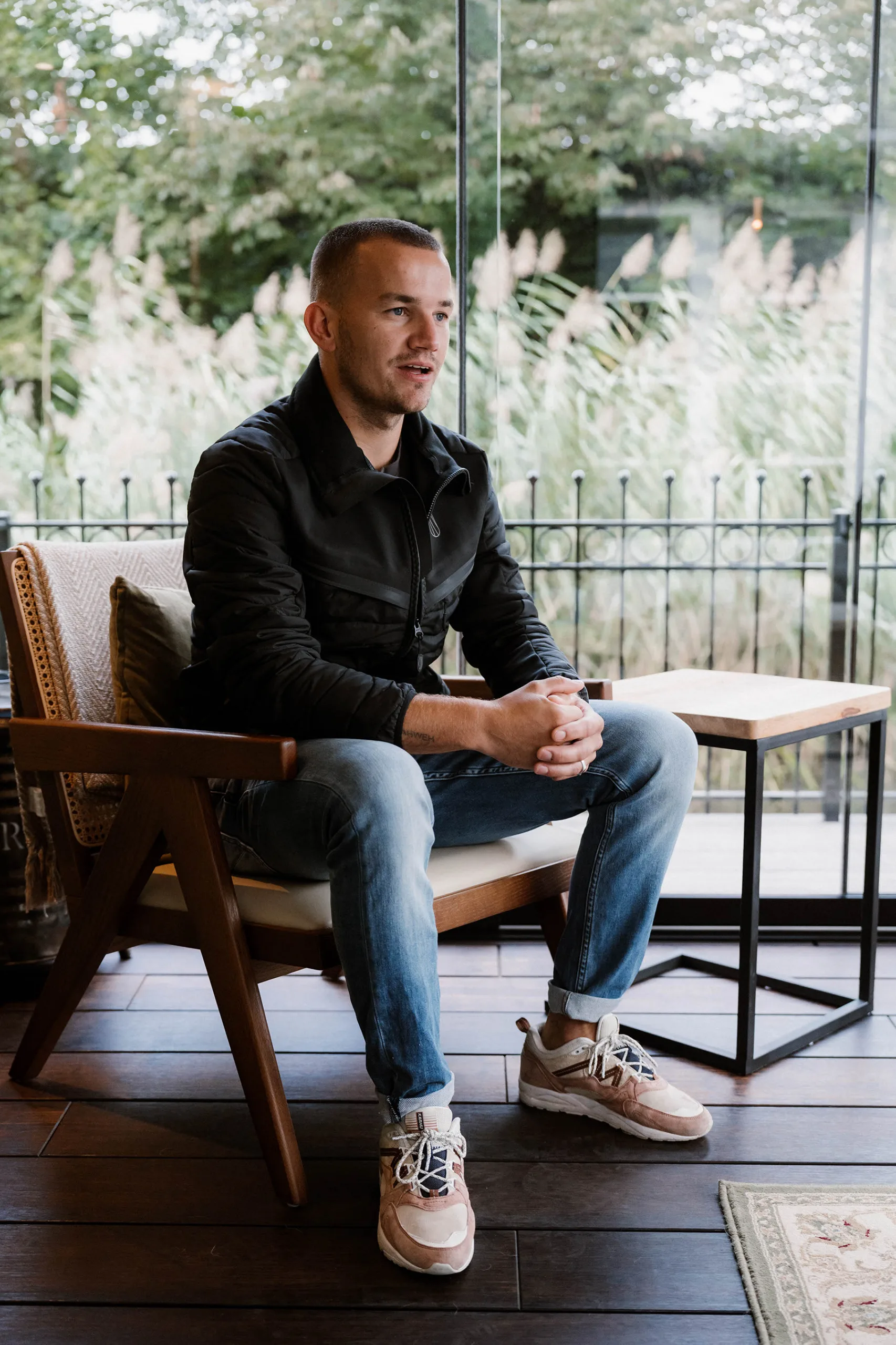 Twee mannen die in gesprek zijn voor een moderne glazen buitenverblijf/tuinkamer met een comfortabele zithoek binnen, tijdens een buitenbijeenkomst of presentatie.